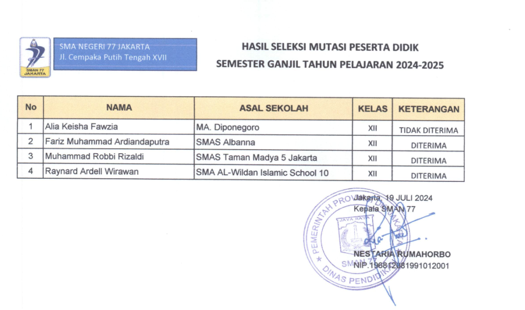 Kami sampaikan hasil seleksi mutasi peserta didik baru SMA Negeri 77 Jakarta pada Semester Ganjil Tahun Pelajaran 2024/2025. Berikut adalah daftar peserta didik yang lolos seleksi: