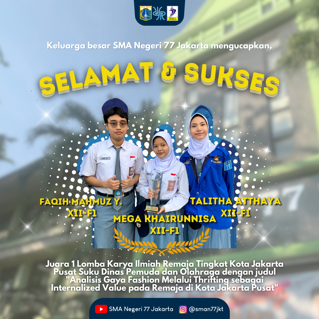 Juara 1 Lomba Karya Ilmiah Remaja Tingkat Kota Jakarta Pusat Suku Dinas Pemuda dan Olahraga dengan judul “Analisis Gaya Fashion Melalui Thrifting sebagai Internalized Value pada Remaja di Kota Jakarta Pusat”