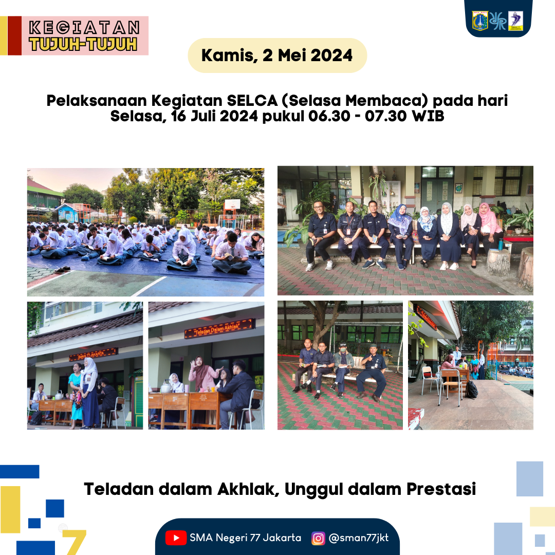 Pada hari Selasa, 16 Juli 2024, SMA Negeri 77 Jakarta menyelenggarakan kegiatan Selasa Membaca (SELCA) yang berlangsung dari pukul 06.30 hingga 07.30. Kegiatan ini diadakan dengan tujuan utama untuk mengembangkan kemampuan literasi dan kreativitas peserta didik. Rangkaian acara terdiri dari Kegiatan Membaca selama 10 menit, Refleksi Bacaan selama 10 menit, dan Penampilan dari Ekstrakurikuler Seni Teater selama 40 menit.