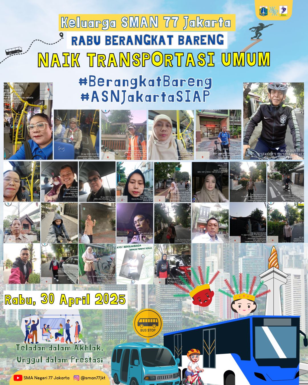 Jakarta, 30 April 2025 – Dalam rangka mendukung upaya Pemerintah Provinsi DKI Jakarta untuk mengurangi polusi udara dan kemacetan lalu lintas, para pendidik dan tenaga kependidikan SMAN 77 Jakarta melaksanakan Instruksi Gubernur DKI Jakarta No. 6 Tahun 2025 dengan penuh semangat. Instruksi tersebut mewajibkan seluruh pegawai di lingkungan Pemprov DKI Jakarta untuk menggunakan angkutan umum massal setiap hari Rabu.
