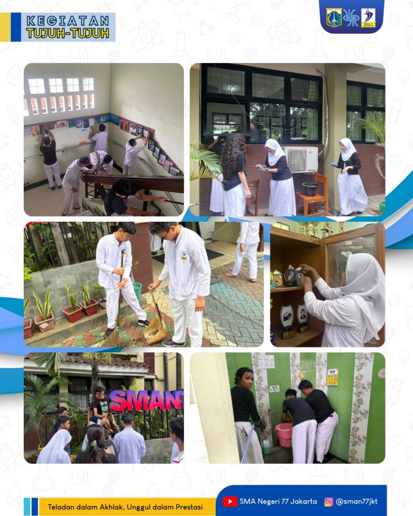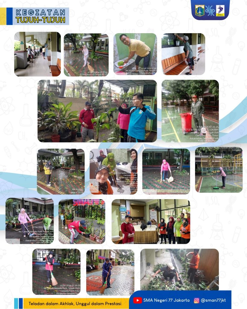 Sebagai tindak lanjut dari instruksi tersebut, keluarga besar SMAN 77 Jakarta melaksanakan kegiatan bersih-bersih lingkungan sekolah bersama peserta didik pada Jumat, 6 Februari 2026. Para peserta didik dengan penuh semangat membersihkan ruang kelas, halaman sekolah, taman, serta area sekitar lingkungan sekolah. Kegiatan ini juga menjadi bagian dari pembiasaan karakter peduli lingkungan yang terus ditanamkan di SMAN 77 Jakarta.